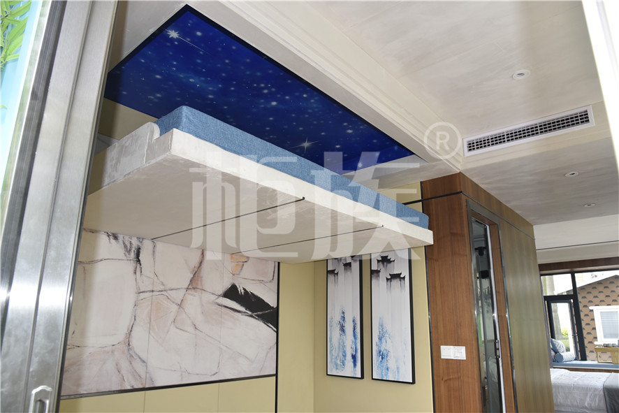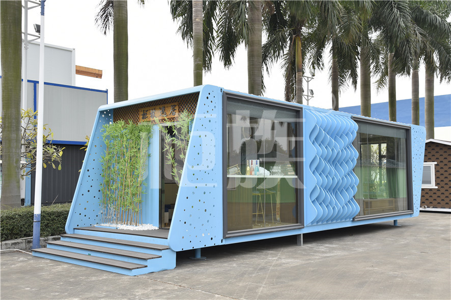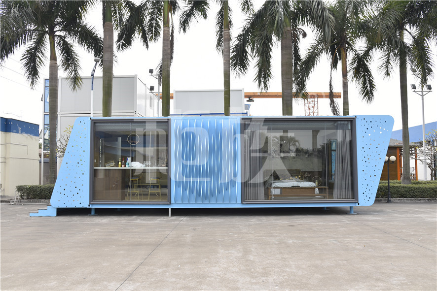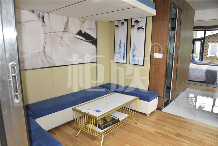功能布局:入戶臺階,箱子整體抬高,前廳設吧臺和茶幾,樓面為隱藏式升降床,中部為衣柜、洗手臺及衛生間,臥室內帶飄窗陽臺,配影音系統。大面積落地玻璃窗,適合觀景。設計用途為景區特色民宿。