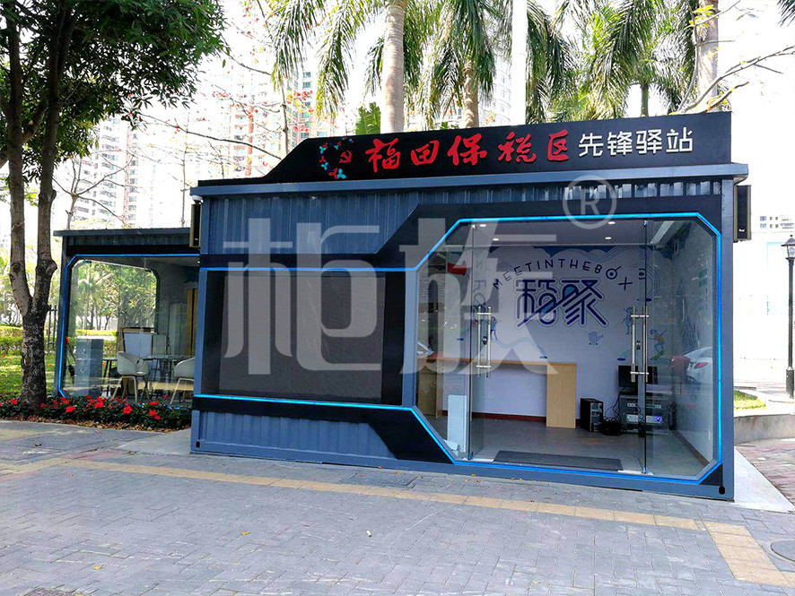 驛站使用兩個集裝箱錯位串聯而成,正面墻體使用大面積玻璃門窗,線條流暢、造型時尚、通透亮堂,很好的突出了驛站的標志性與開放性的特點。