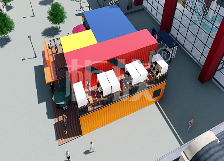 彩色外觀引人注目,集裝箱的隨意組合功能可以根據需要延展空間使用面積。一層可供展品擺放,二層陽臺可供休息娛樂。